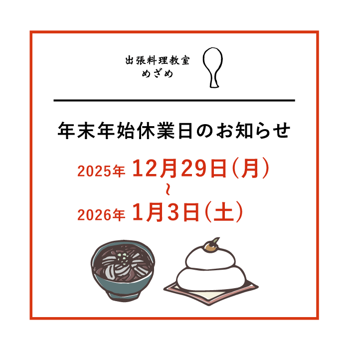 【年末年始休業日】 2025年12月29日(月)~2026年1月3日(土) 未分類 2025.12.24 【年末年始休業日】 2025年12月29日(月)~2026年1月3日(土) 本年も、出張料理教室めざめのレッスンをご受講、またご注目いただき、誠にありがとうございます。当教室は、年末年始の上記期間休業いたします。 期間中のお問い合わせは、1月4日(日)以降にご返信いたします。ご不便おかけいたしますが、何卒ご了承お願いいたします。 出張料理教室めざめ